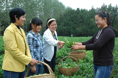 山东临沭大学生村官李平(右)和春山茶园的农家采茶女们一起采摘茶叶。李平是茶果专业的应届大学毕业生,她发挥自己所学专业优势,服务当地的特色茶果种植,深入田间地头向农村青年传授茶叶种植、采摘和加工技术,受到当地农民信任和欢迎。